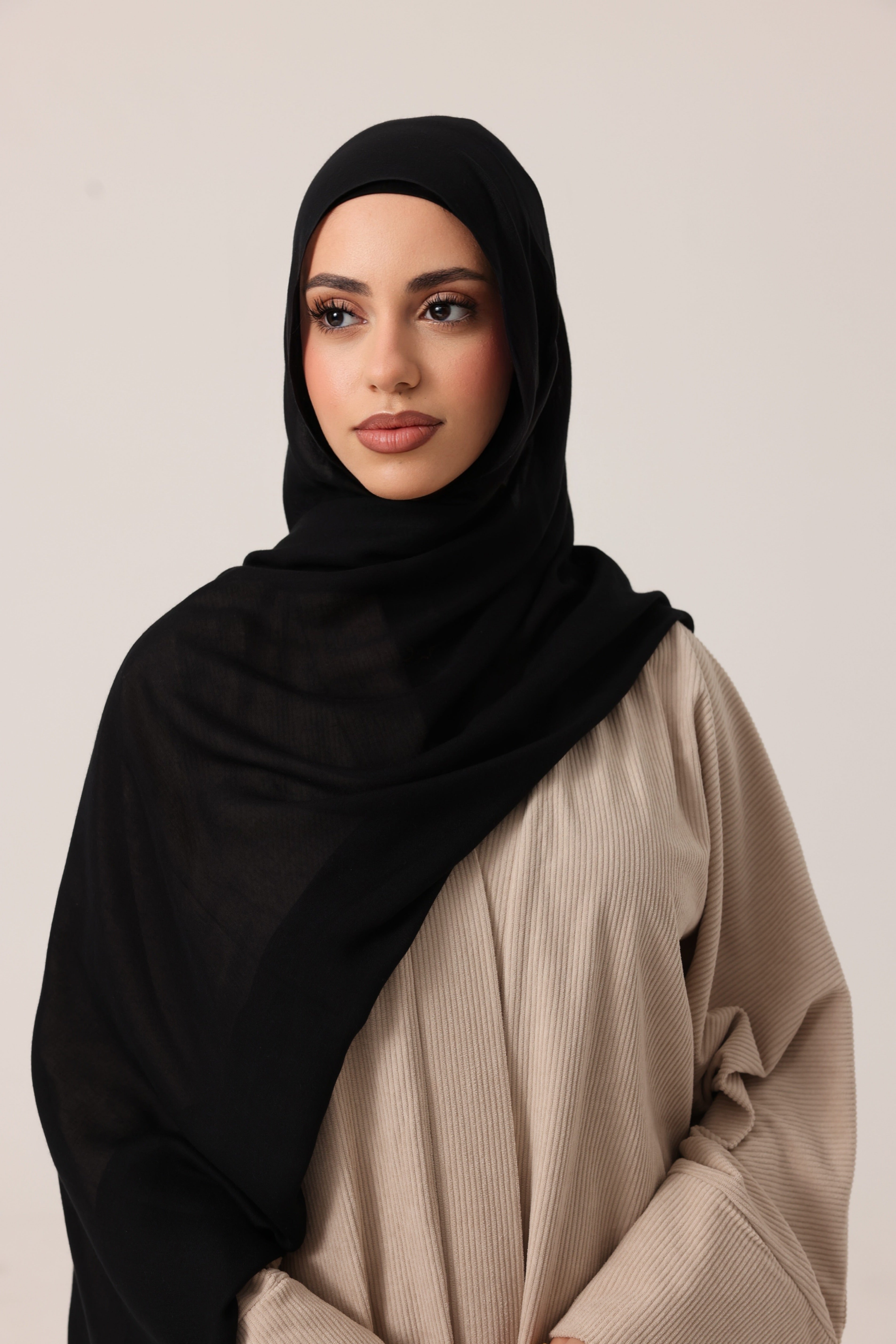 Premium modal hijab known for its soft, silky texture and lightweight feel. The drape of modal is fluid and elegant, allowing the hijab to fall beautifully around the face and shoulders.